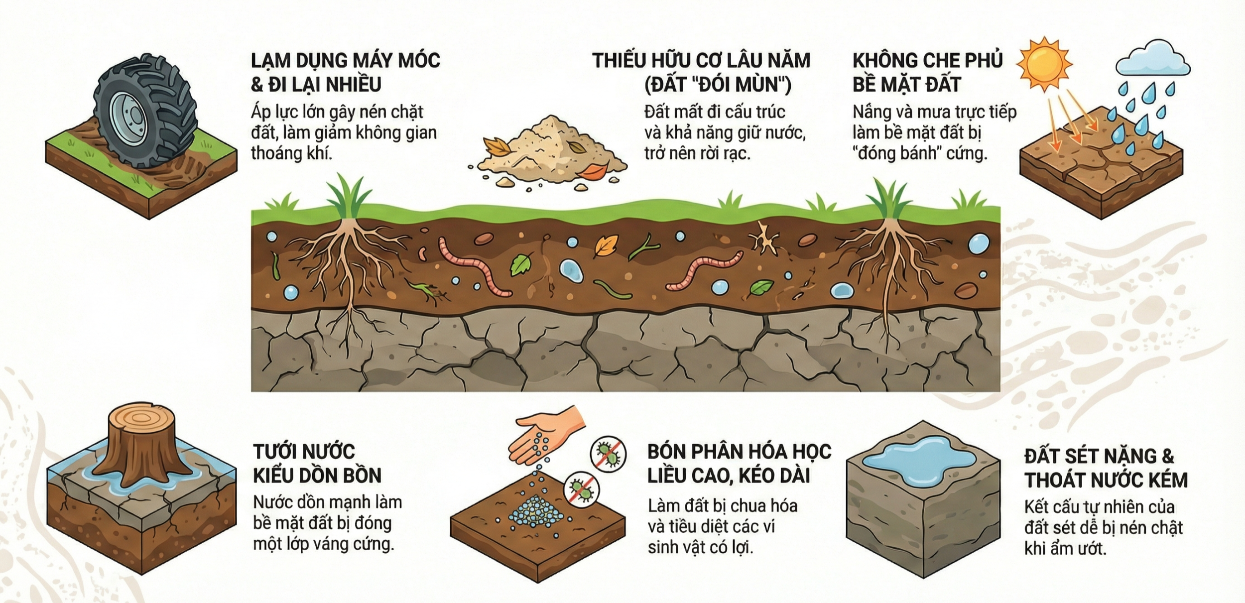 3) 6 nguyên nhân làm đất chai cứng (hay gặp ở vườn cây ăn trái)