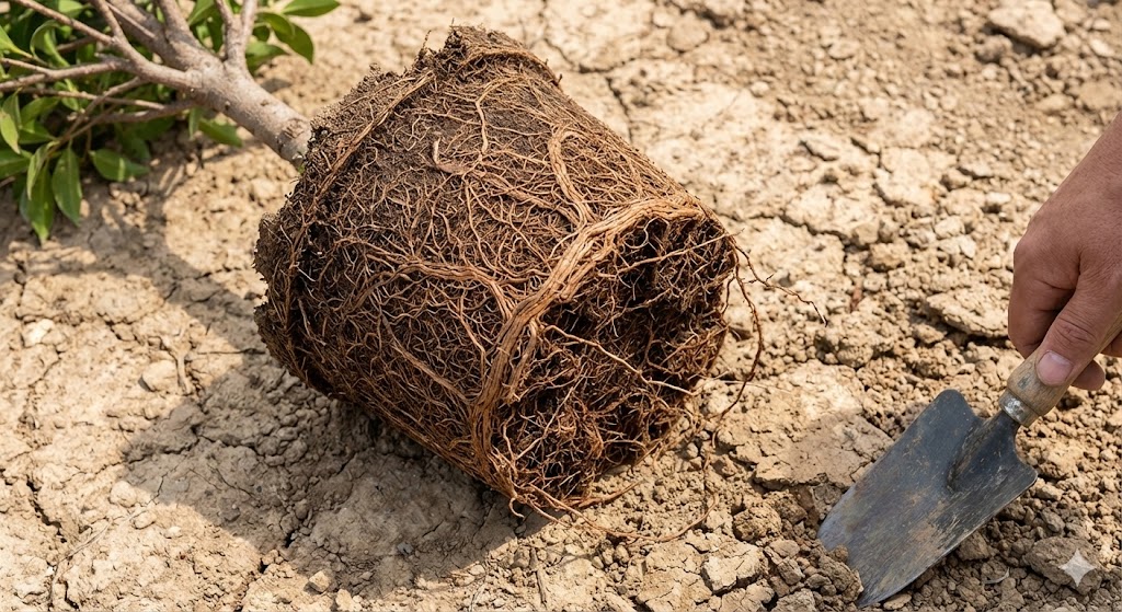 Đất chai cứng là đất bị nén chặt, ít khe hở, ít mùn hữu cơ → nước khó thấm, rễ khó ăn, cây bón phân nhiều vẫn không hiệu quả. Cây ăn trái rễ tơ yếu sẽ dễ: vàng lá, rụng hoa, rụng trái non, thối rễ.